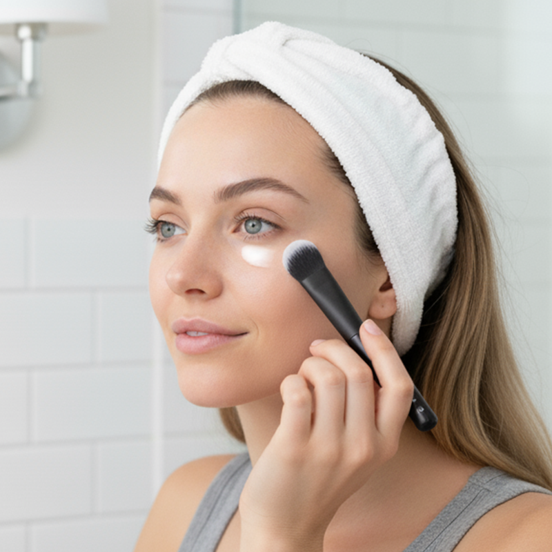 Applicare una quantità pari a un pisello e picchiettare delicatamente uno strato sottile sotto ciascun occhio. Non strofinare; meno è meglio.